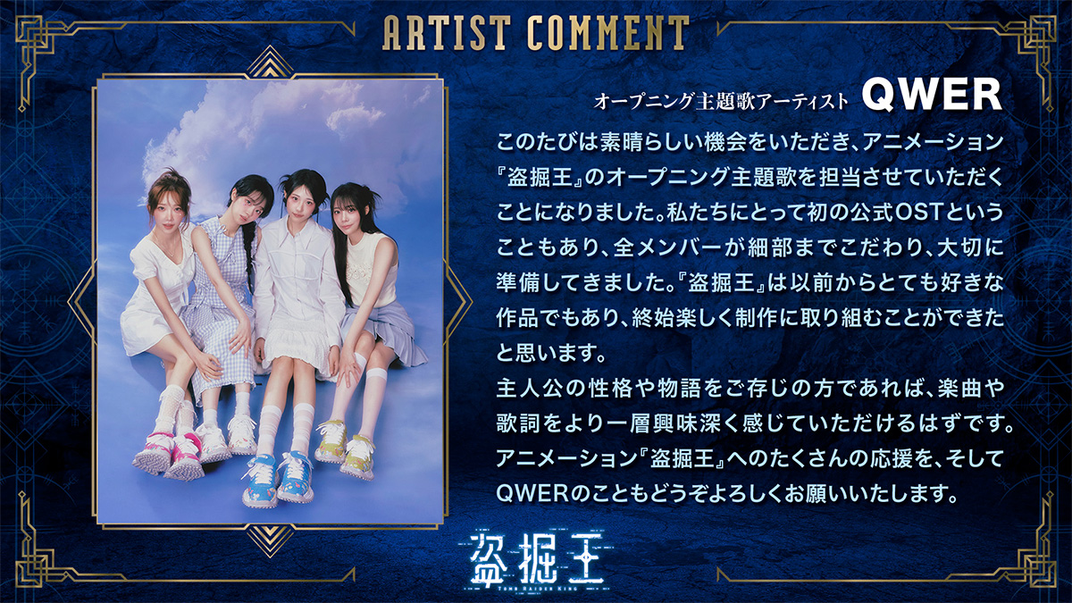 TVアニメ「盗掘王」のオープニング主題歌は、「QWER」が歌う「SHOW DOWN」に決定。「QWER」初のアニメタイアップ・日本語歌唱による楽曲。